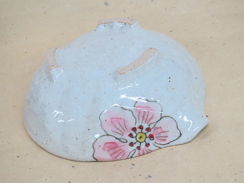 粉引の白にピンク色のかわいらしい花が咲いている片口鉢です。